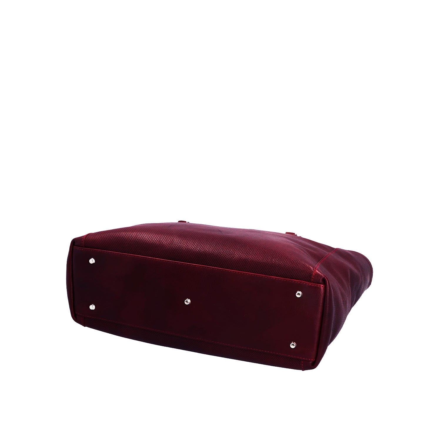 胴部分にパンチング加工を施し、ハンドルを支える手縫いのステッチがデザインのアクセントになっています。