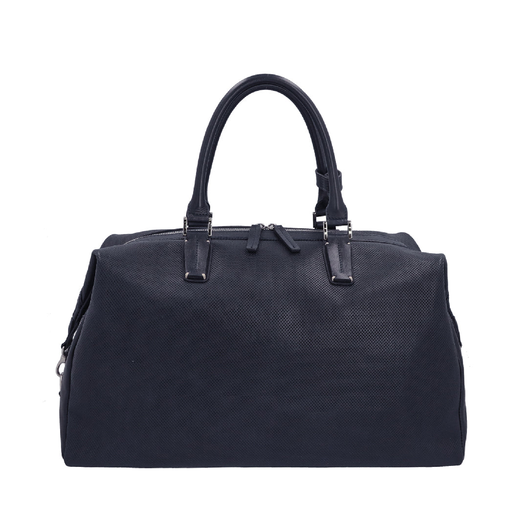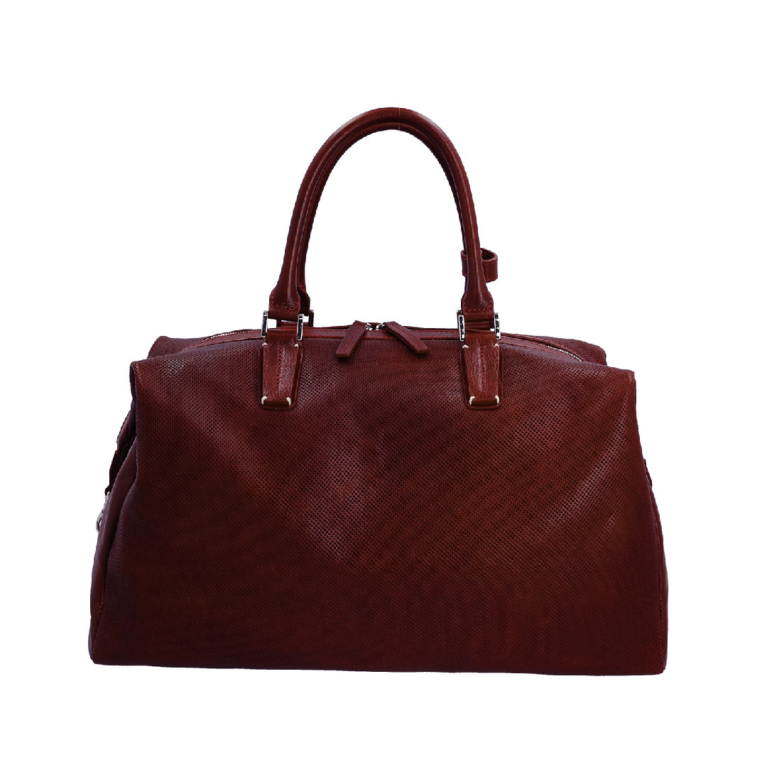 胴部分にパンチング加工を施し、ハンドルを支える手縫いのステッチがデザインのアクセントになっています。