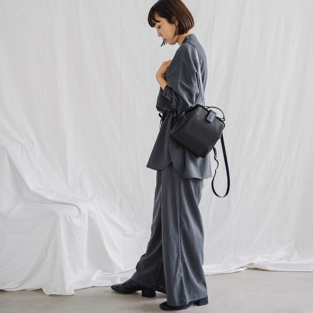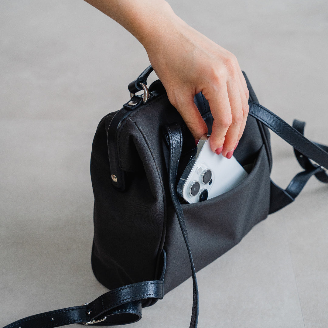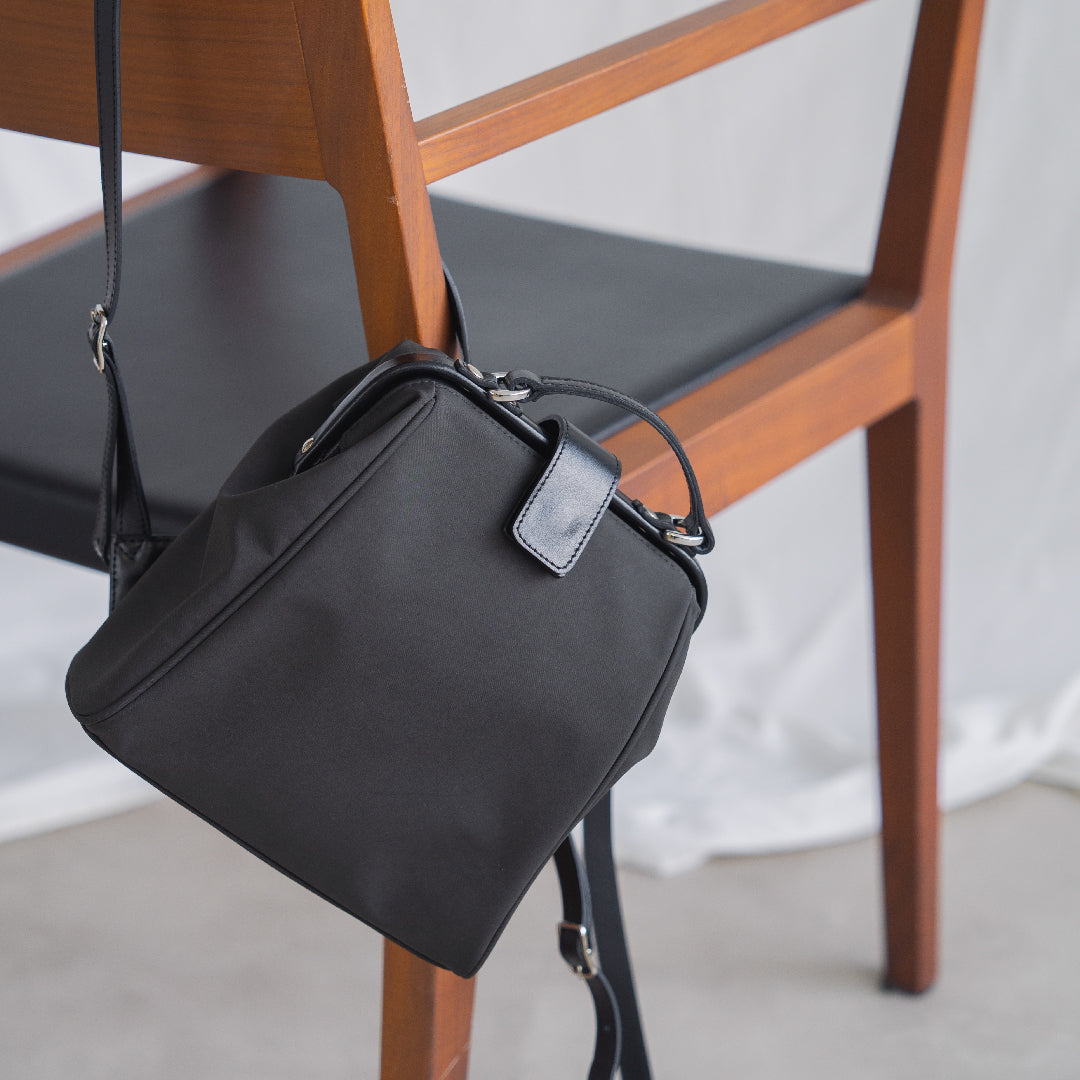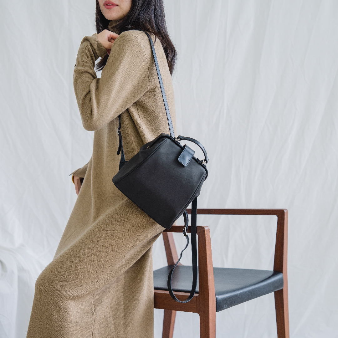 ハリのあるナイロンに、スムースレザーが軽やかさと品格を両立した、大人のための異素材コンビ。