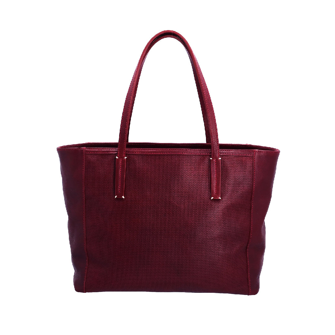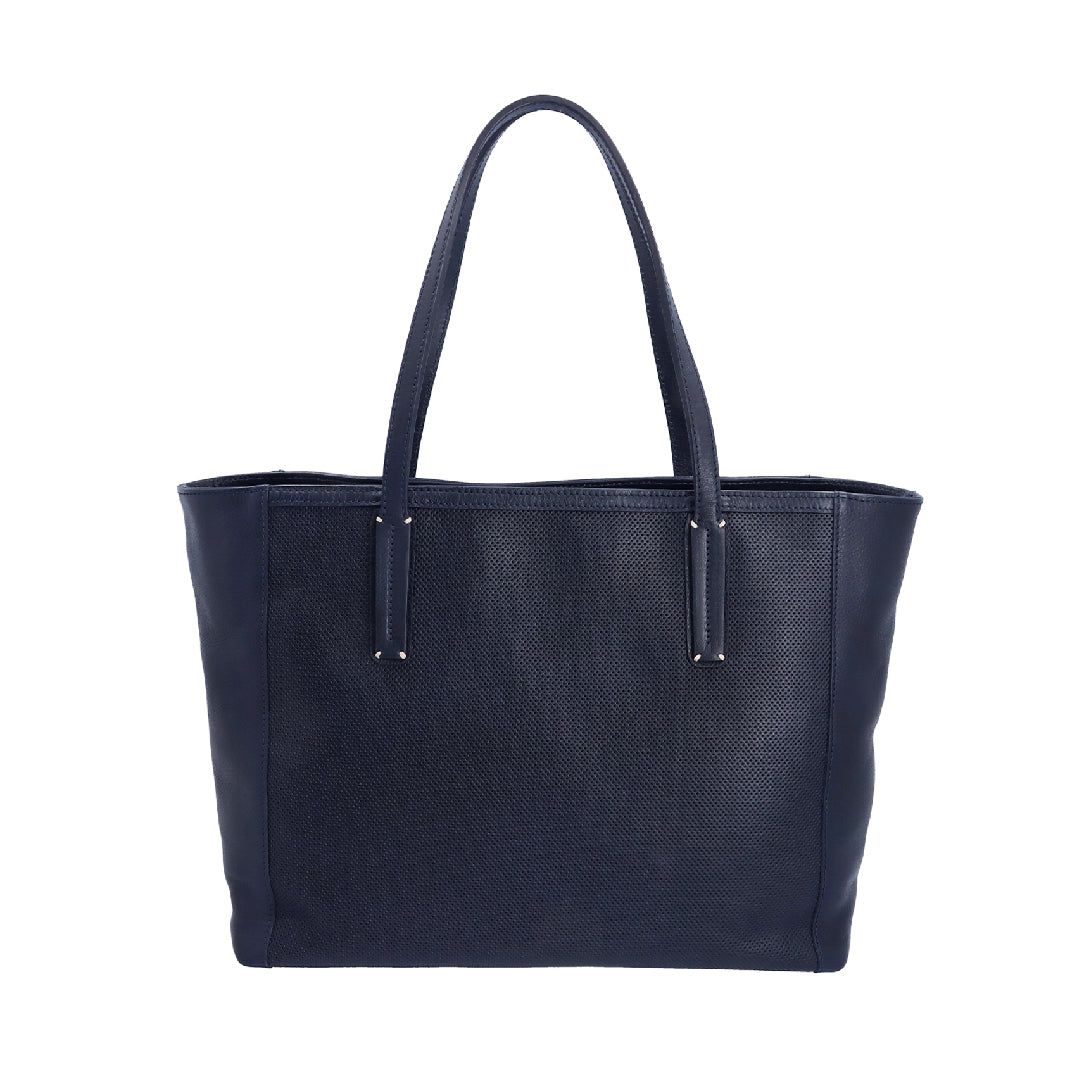 胴部分にパンチング加工を施し、ハンドルを支える手縫いのステッチがデザインのアクセントになっています。